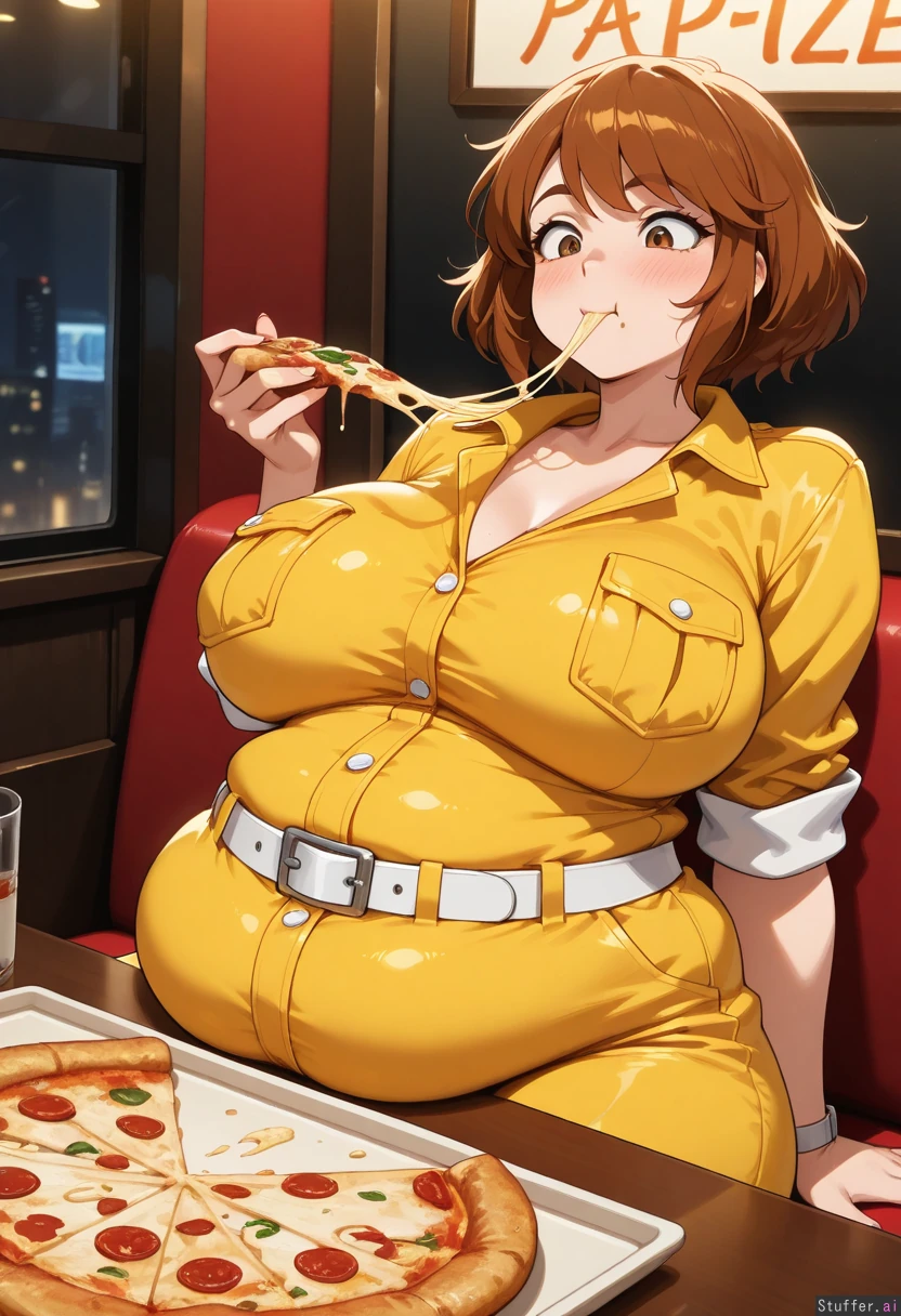 (High quality, ultra high definition, 8k, masterpiece, incredible shading and lighting) 1 female, solo, (april o'neil), (wearing yellow jumpsuit with white belt), (morbidly obese:.0), (gigantic belly:1.0), (fully clothed, white belt unbuckled, buttons very tight on clothes), large breasts, wide waist, (belly on top of table), (front view, view of upper body only) (In pizza restaurant, sitting in booth in front of table, eating pizza, blushing, excited)