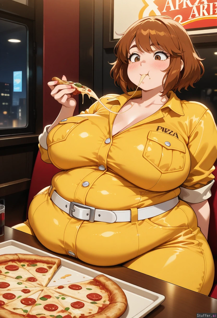 (High quality, ultra high definition, 8k, masterpiece, incredible shading and lighting) 1 female, solo, (april o'neil), (wearing yellow jumpsuit with white belt), (morbidly obese:1.0), (gigantic belly:1.0), (fully clothed, white belt unbuckled, buttons very tight on clothes), large breasts, wide waist, (belly on top of table), (front view, view of upper body only) (In pizza restaurant, sitting in booth in front of table, eating pizza, blushing, excited)