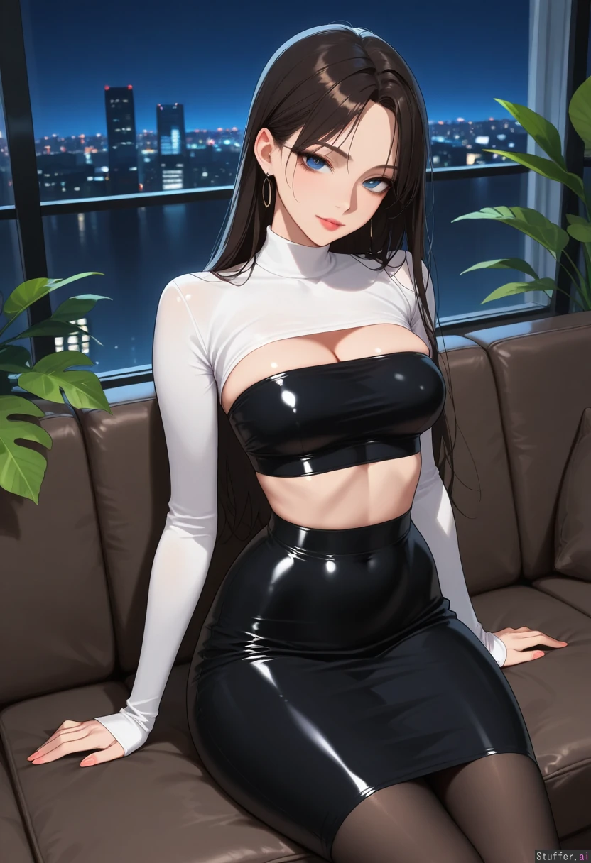 21 year old Korean female (gorgeous, stunning, beautiful, sexy, nsfw, correct anatomy), (skinny:1.25), (dark skinned:1.25), perfect anatomy, long wavy dark brown hair, slim face, blue eyes, defined jawline, makeup, narrow shoulders, medium breasts, (narrow waist:1.3)(chubby belly:1.1), (wide hips:1.05), (thick thighs:1.05), (long skin-tight tube top with long sleeves:1.2)(long black tight skirt:1.2) modern outdoor rooftop lounge, outside, outdoors, modern plants in background, skyline, night time sitting on couch, seductive look