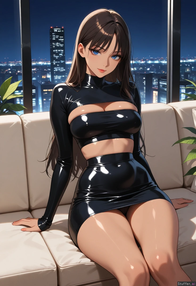 21 year old Korean female (gorgeous, stunning, beautiful, sexy, nsfw, correct anatomy), (skinny:1.25), (dark skinned:1.25), perfect anatomy, long wavy dark brown hair, slim face, blue eyes, defined jawline, makeup, narrow shoulders, medium breasts, (narrow waist:1.3)(chubby belly:1.1), (wide hips:1.05), (thick thighs:1.05), (long skin-tight tube top with long sleeves:1.2)(chest exposed)(long black tight skirt:1.2)(legs covered) modern outdoor rooftop lounge, outside, outdoors, modern plants in background, skyline, night time sitting on couch, seductive look