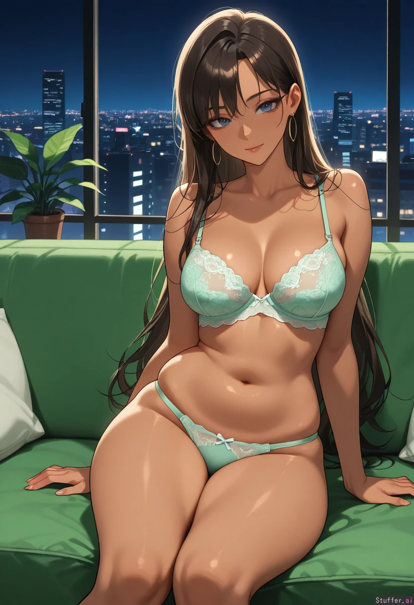 21 year old Korean female (gorgeous, stunning, beautiful, sexy, nsfw, correct anatomy), (skinny:1.25), (dark skinned:1.25), perfect anatomy, long wavy dark brown hair, slim face, blue eyes, defined jawline, makeup, narrow shoulders, medium breasts, (narrow waist:1.3)(soft chubby pudgy belly:1.15), (wide hips:1.05), (thick thighs:1.05), sage green lace bra and panties modern outdoor rooftop lounge, outside, outdoors, modern plants in background, skyline, night time sitting on couch, seductive look