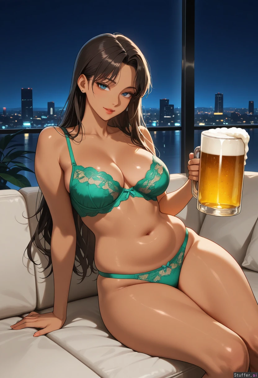 21 year old Korean female (gorgeous, stunning, beautiful, sexy, nsfw, correct anatomy), (skinny:1.25), (dark skinned:1.25), perfect anatomy, long wavy dark brown hair, slim face, blue eyes, defined jawline, makeup, narrow shoulders, medium breasts, (narrow waist:1.3)(soft chubby pudgy belly:1.15), (wide hips:1.05), (thick thighs:1.05), sage green lace bra and panties modern outdoor rooftop lounge, outside, outdoors, modern plants in background, skyline, night time sitting on couch, seductive look, holding giant beer pitcher