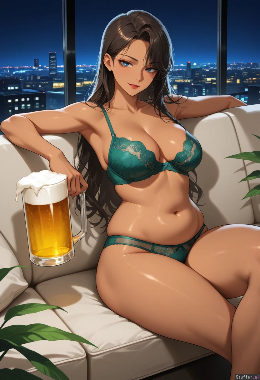 21 year old Korean female (gorgeous, stunning, beautiful, sexy, nsfw, correct anatomy), (skinny:1.25), (dark skinned:1.25), perfect anatomy, long wavy dark brown hair, slim face, blue eyes, defined jawline, makeup, narrow shoulders, medium breasts, (narrow waist:1.3)(soft chubby pudgy belly:1.15), (wide hips:1.05), (thick thighs:1.05), sage green lace bra and panties modern outdoor rooftop lounge, outside, outdoors, modern plants in background, skyline, night time sitting on couch, seductive look, smirking, holding giant beer pitcher up to belly