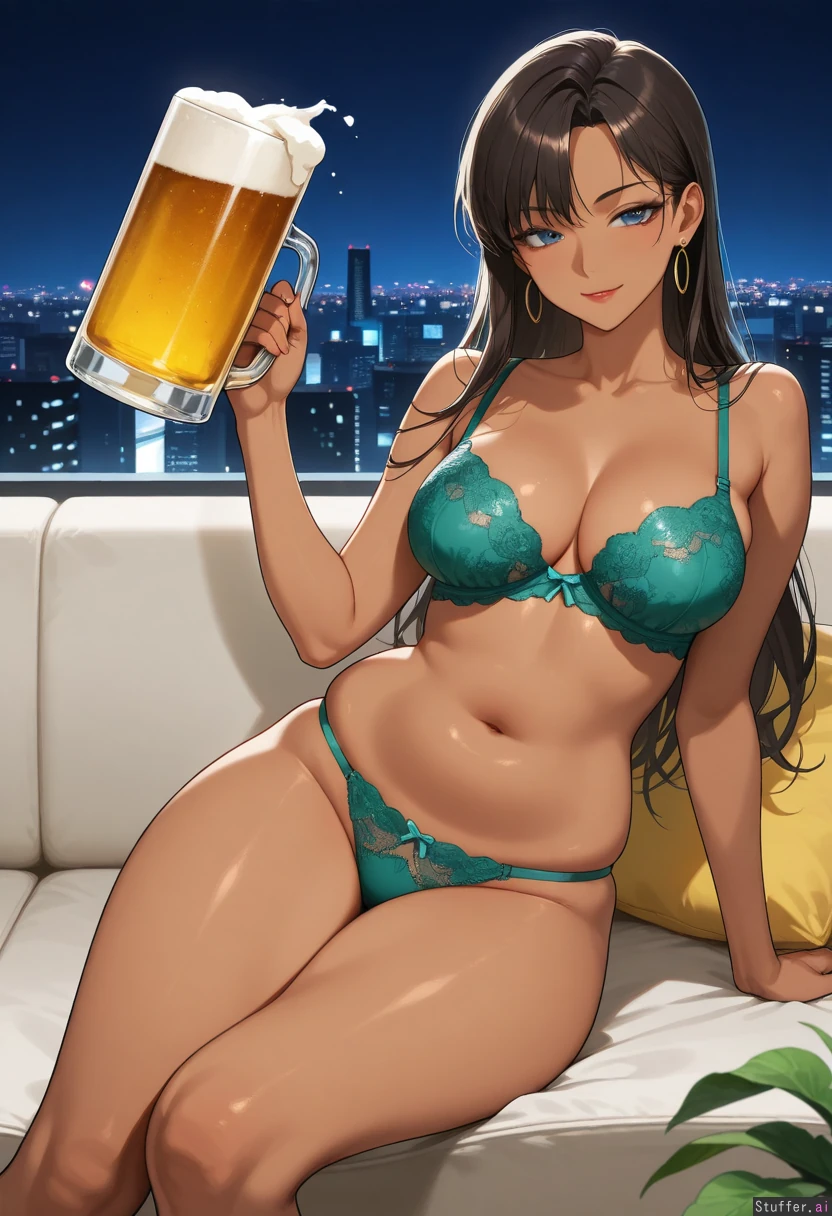 21 year old Korean female (gorgeous, stunning, beautiful, sexy, nsfw, correct anatomy), (skinny:1.25), (dark skinned:1.25), perfect anatomy, long wavy dark brown hair, slim face, blue eyes, defined jawline, makeup, narrow shoulders, medium breasts, (narrow waist:1.3)(soft chubby pudgy belly:1.15), (wide hips:1.05), (thick thighs:1.05), sage green lace bra and panties modern outdoor rooftop lounge, outside, outdoors, modern plants in background, skyline, night time sitting on couch, seductive look, smirking, holding giant beer pitcher next to belly