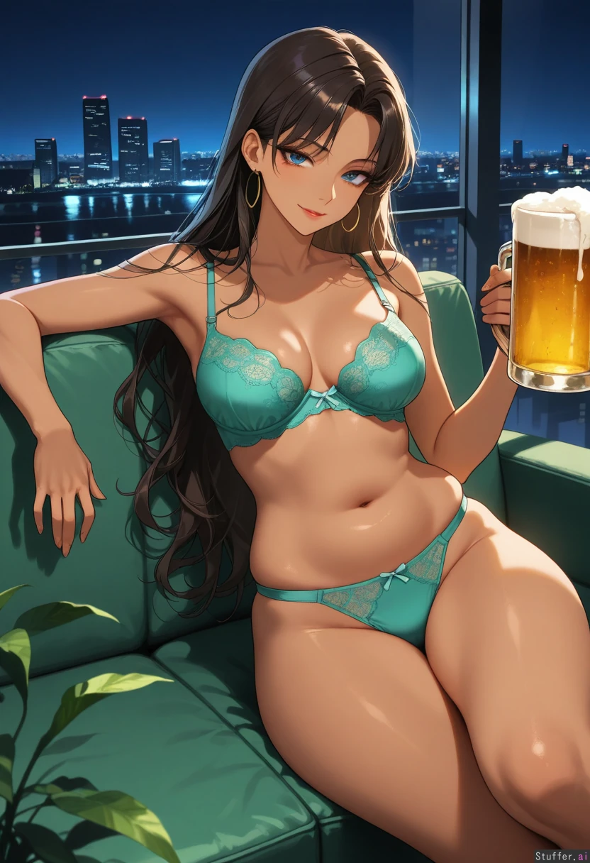 21 year old Korean female (gorgeous, stunning, beautiful, sexy, nsfw, correct anatomy), (skinny:1.25), (dark skinned:1.25), perfect anatomy, long wavy dark brown hair, slim face, blue eyes, defined jawline, makeup, narrow shoulders, medium breasts, (narrow waist:1.3)(soft chubby pudgy belly:1.15), (wide hips:1.05), (thick thighs:1.05), sage green lace bra and panties modern outdoor rooftop lounge, outside, outdoors, modern plants in background, skyline, night time sitting on couch, seductive look, smirking, holding giant beer pitcher below next to belly