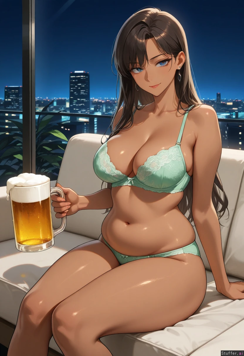 21 year old Korean female (gorgeous, stunning, beautiful, sexy, nsfw, correct anatomy), (skinny:1.25), (dark skinned:1.25), perfect anatomy, long wavy dark brown hair, slim face, blue eyes, defined jawline, makeup, narrow shoulders, medium breasts, (narrow waist:1.3)(soft chubby pudgy belly:1.15), (wide hips:1.05), (thick thighs:1.05), sage green lace bra and panties modern outdoor rooftop lounge, outside, outdoors, modern plants in background, skyline, night time sitting on couch, seductive look, smirking, holding giant beer pitcher below next to belly