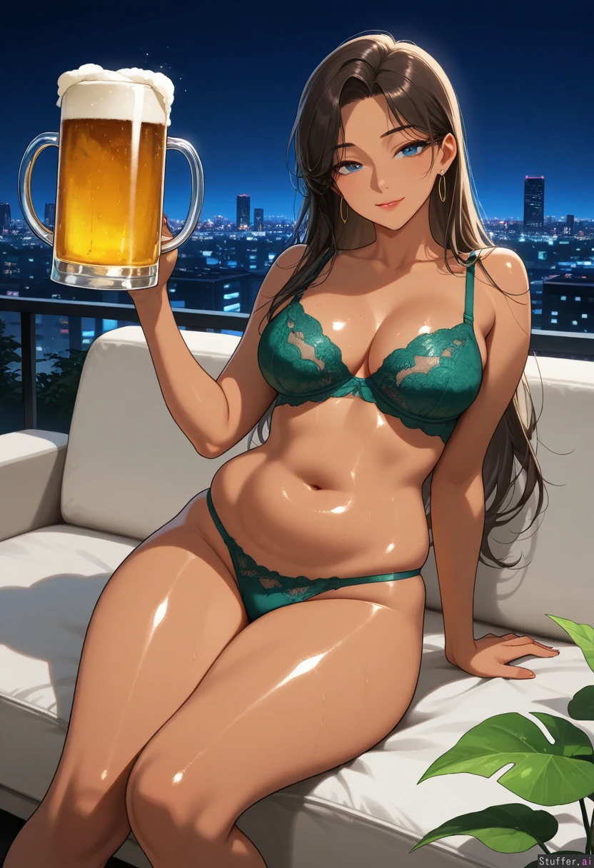 21 year old Korean female (gorgeous, stunning, beautiful, sexy, nsfw, correct anatomy), (skinny:1.25), (dark skinned:1.25), perfect anatomy, long wavy dark brown hair, slim face, blue eyes, defined jawline, makeup, narrow shoulders, medium breasts, (narrow waist:1.3)(soft chubby pudgy belly:1.15), (wide hips:1.05), (thick thighs:1.05), sage green lace bra and panties, (glossy lotioned oily body:1.2) modern outdoor rooftop lounge, outside, outdoors, modern plants in background, skyline, night time sitting on couch, seductive look, smirking, holding giant beer pitcher below next to belly