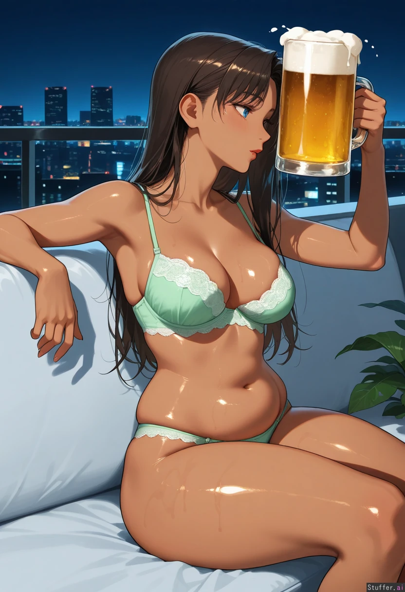 21 year old Korean female (gorgeous, stunning, beautiful, sexy, nsfw, correct anatomy), (skinny:1.25), (dark skinned:1.25), perfect anatomy, long wavy dark brown hair, slim face, blue eyes, defined jawline, makeup, narrow shoulders, medium breasts, (narrow waist:1.3)(soft chubby pudgy belly:1.15), (wide hips:1.05), (thick thighs:1.05), sage green lace bra and panties, (glossy lotioned oily body:1.2) modern outdoor rooftop lounge, outside, outdoors, modern plants in background, skyline, night time, side view sitting on couch, drinking beer from giant beer pitcher (((head tilted back:1.4)))