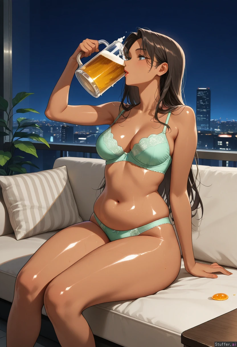 21 year old Korean female (gorgeous, stunning, beautiful, sexy, nsfw, correct anatomy), (skinny:1.25), (dark skinned:1.25), perfect anatomy, long wavy dark brown hair, slim face, blue eyes, defined jawline, makeup, narrow shoulders, medium breasts, (narrow waist:1.3)(soft chubby pudgy belly:1.15), (wide hips:1.05), (thick thighs:1.05), sage green lace bra and panties, (glossy lotioned oily body:1.2) modern outdoor rooftop lounge, outside, outdoors, modern plants in background, skyline, night time, side view sitting on couch, drinking beer from giant beer pitcher (((head tilted back:1.4)))