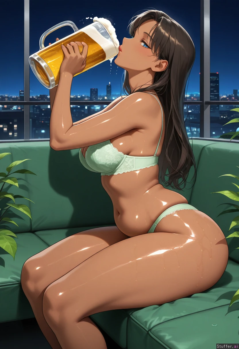 21 year old Korean female (gorgeous, stunning, beautiful, sexy, nsfw, correct anatomy), (skinny:1.25), (dark skinned:1.25), perfect anatomy, long wavy dark brown hair, slim face, blue eyes, defined jawline, makeup, narrow shoulders, medium breasts, (narrow waist:1.3)(soft chubby pudgy belly:1.15), (wide hips:1.05), (thick thighs:1.05), sage green lace bra and panties (skindentation), (glossy lotioned oily body:1.3) modern outdoor rooftop lounge, outside, outdoors, modern plants in background, skyline, night time, side view sitting on couch, drinking beer (from giant beer pitcher), (((head tilted back:1.4)))