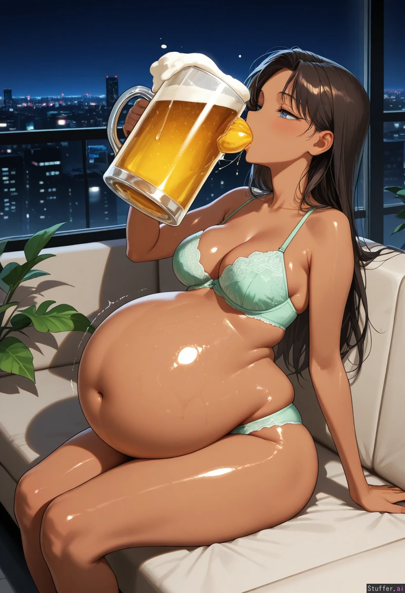 21 year old Korean female (gorgeous, stunning, beautiful, sexy, nsfw, correct anatomy), (skinny:1.25), (dark skinned:1.25), perfect anatomy, long wavy dark brown hair, slim face, blue eyes, defined jawline, makeup, narrow shoulders, medium breasts, (narrow waist:1.3)(soft chubby pudgy belly:1.15), (wide hips:1.05), (thick thighs:1.05), sage green lace bra and panties (skindentation), (glossy lotioned oily body:1.3) modern outdoor rooftop lounge, outside, outdoors, modern plants in background, skyline, night time, side view sitting on couch, drinking beer (from giant beer pitcher), (((head tilted back:1.4))) (((hyper inflated belly:1.6)))