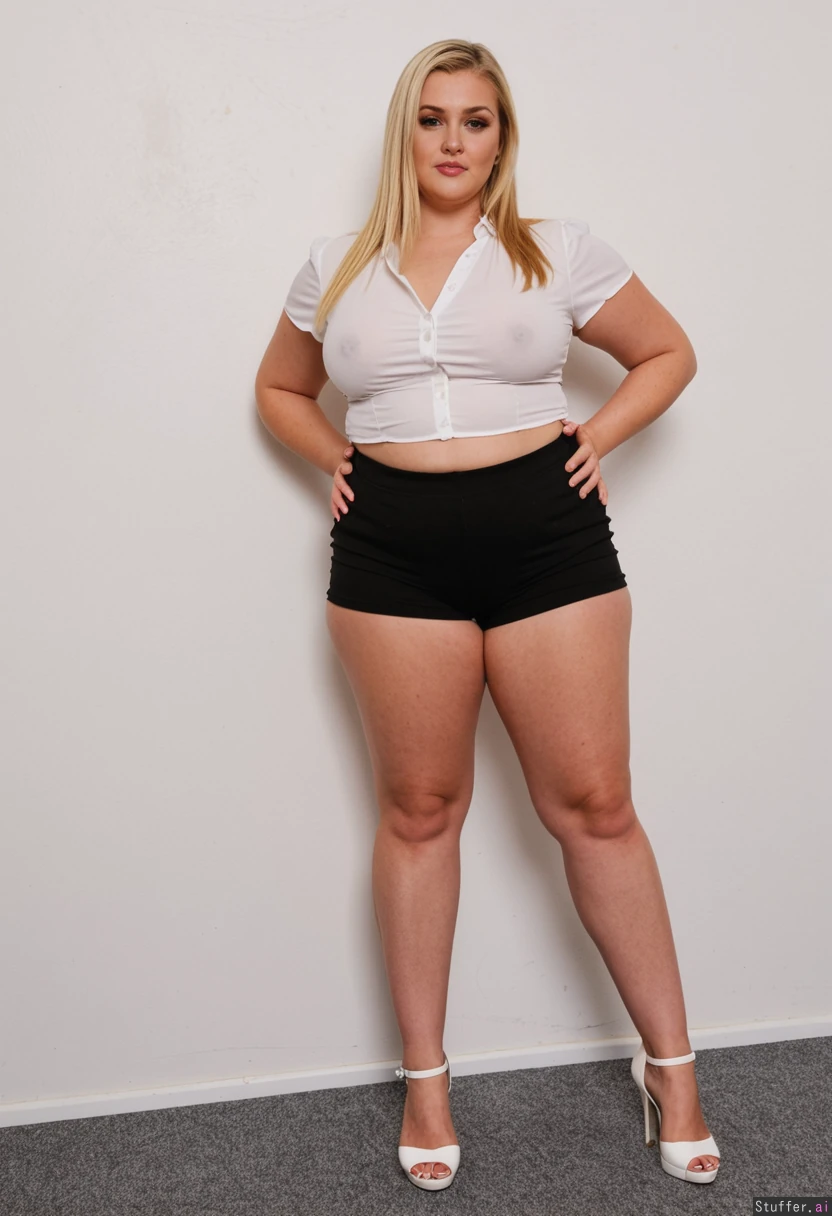 gorgeous blonde girl, long slim legs, elegant loose black shorts, white open high heels, white blouse, chubby arms, small tits, fat waist,