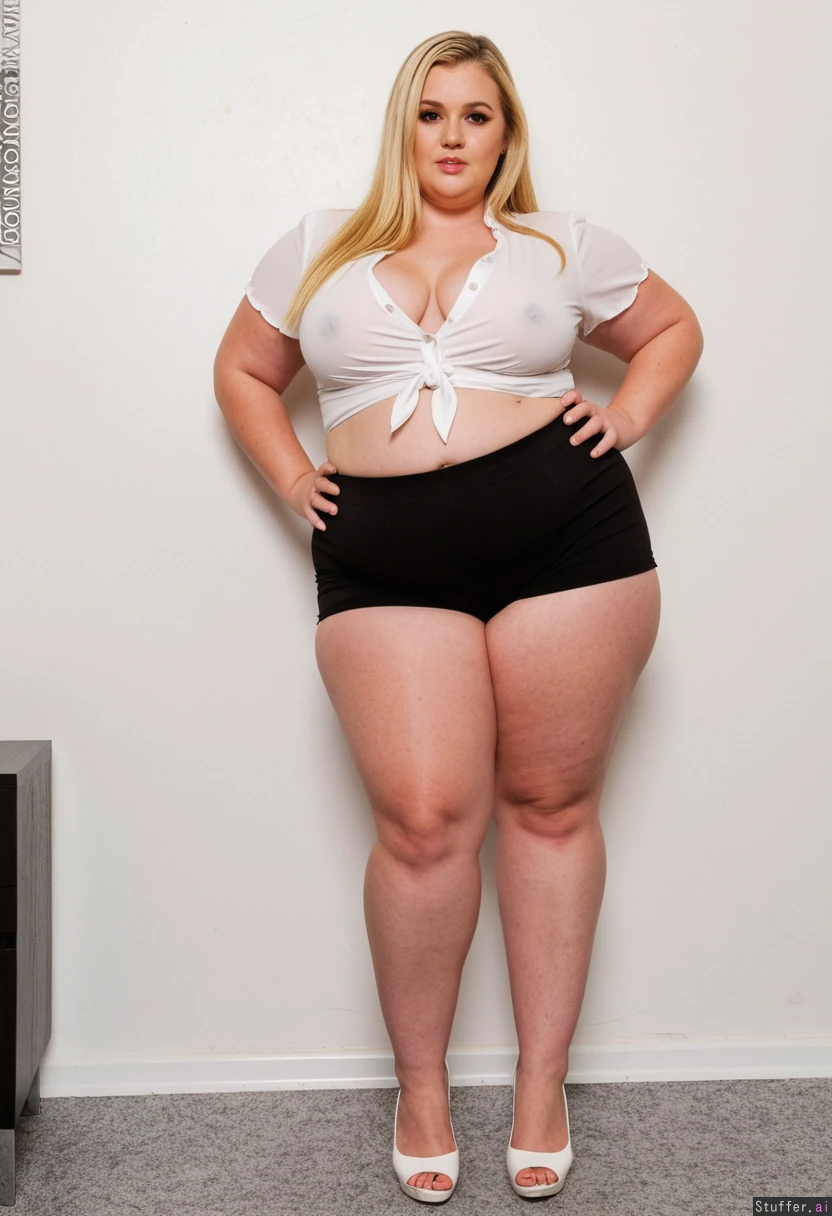 gorgeous blonde girl, long slim legs, elegant loose black shorts, white open high heels, white blouse, chubby arms, small tits, fat waist, (obese:1.1)