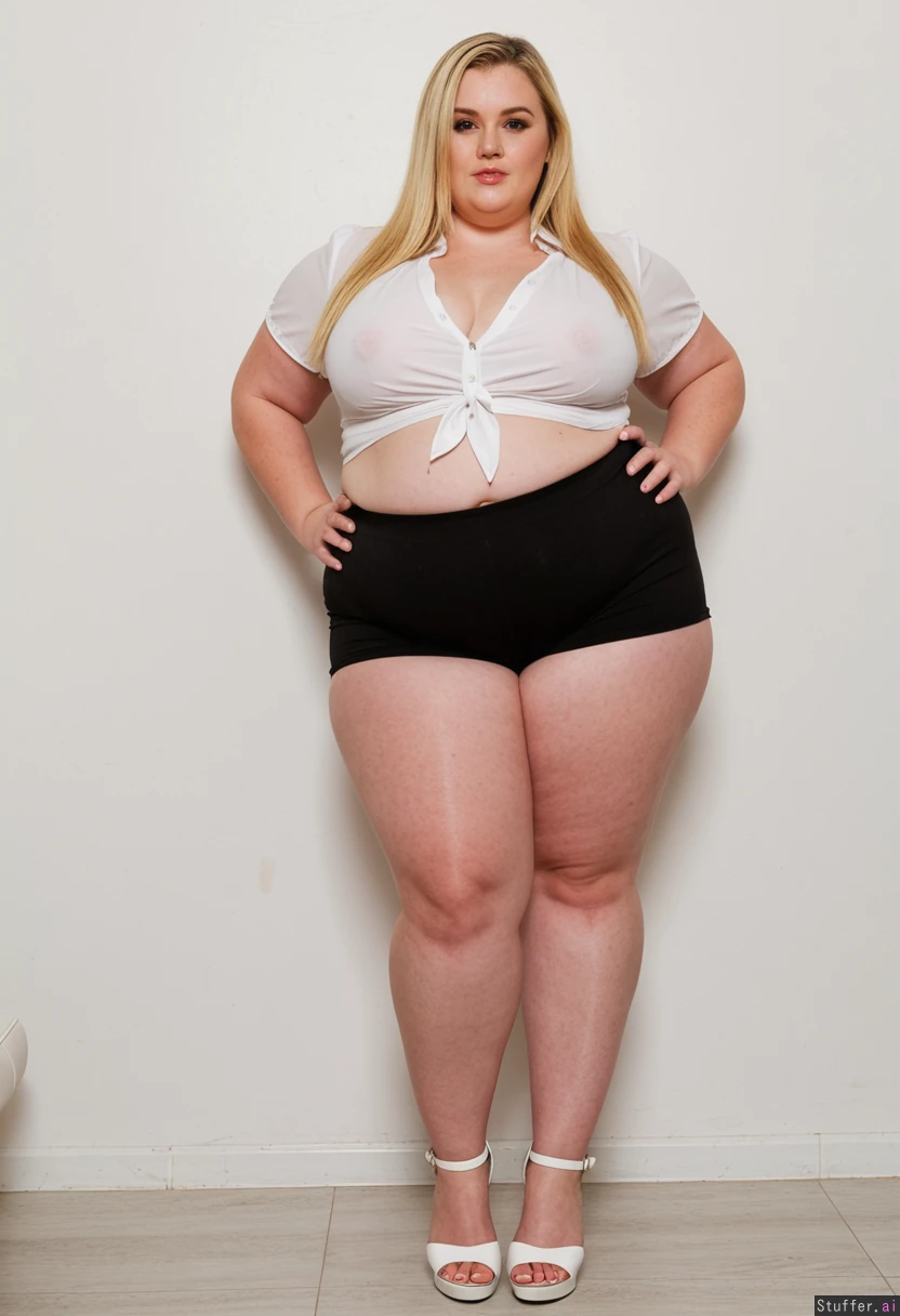 gorgeous blonde girl, long slim legs, elegant loose black shorts, white open high heels, white blouse, chubby arms, small tits, fat waist, (obese:1.2)
