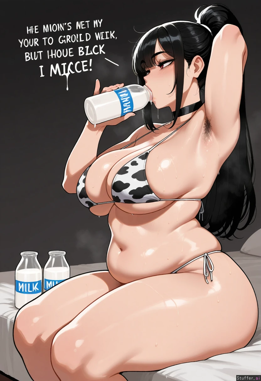 extremely high resoultion, masterpiece, amazing resolution, nyantcha(artist), krekkov (artist), 8k quality, insane quality black_hair, medium_hair, straight_hair, sitting on the bed, cow striped bikini, thick_thighs , ponytail , grabbing large plastic milk bottle, many plastic large milk bottle, straight_hair, drinking milk, bangs, medium_breasts, armpit_hair, sweaty_body , medium ass, wet armpit, no_tail, chubby_belly, medium_breasts, long sweaty armpit_hair, burping, milk dripping, round belly