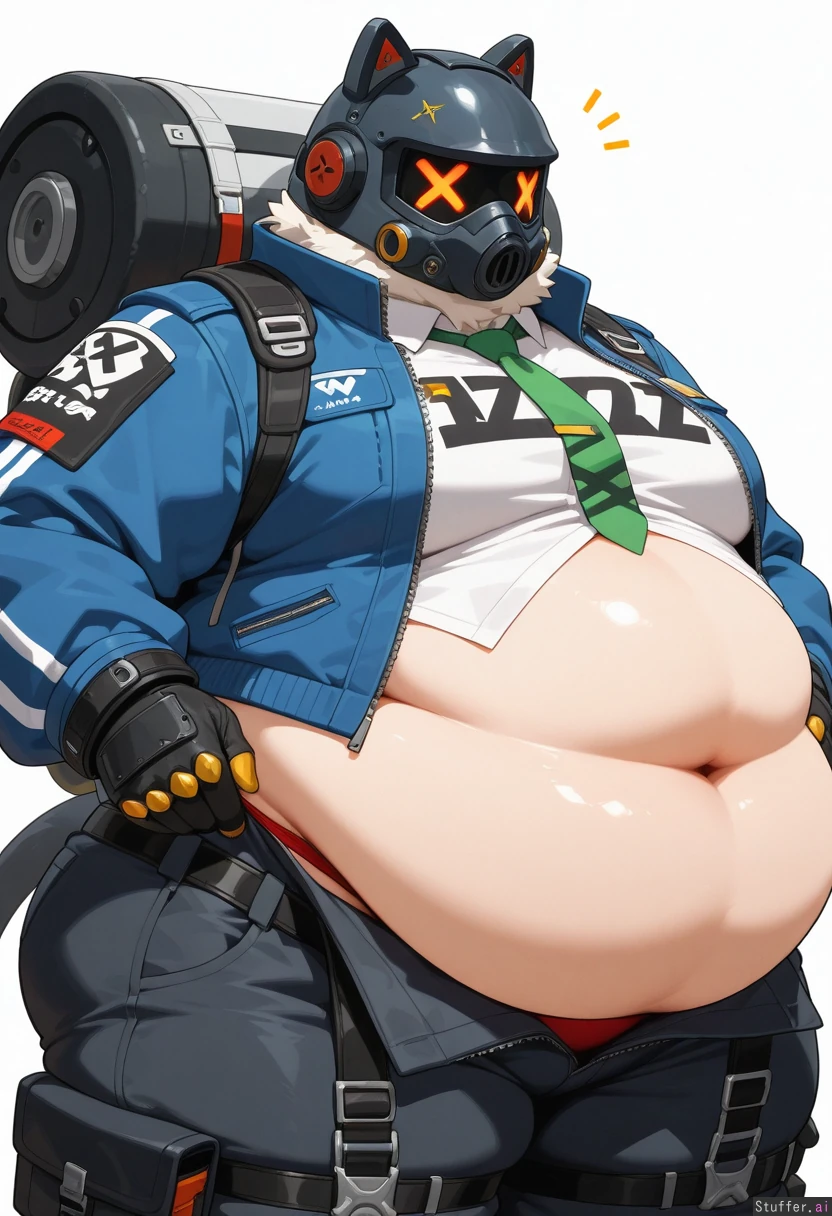 (Solo), Highres, Zhu_Yuan_(Zenless Zone Zero), (Obese), Huge belly, pants open, red panties, white background, black pants, weight gain, white buton shirt, green tie, riot gear, blue jacket
