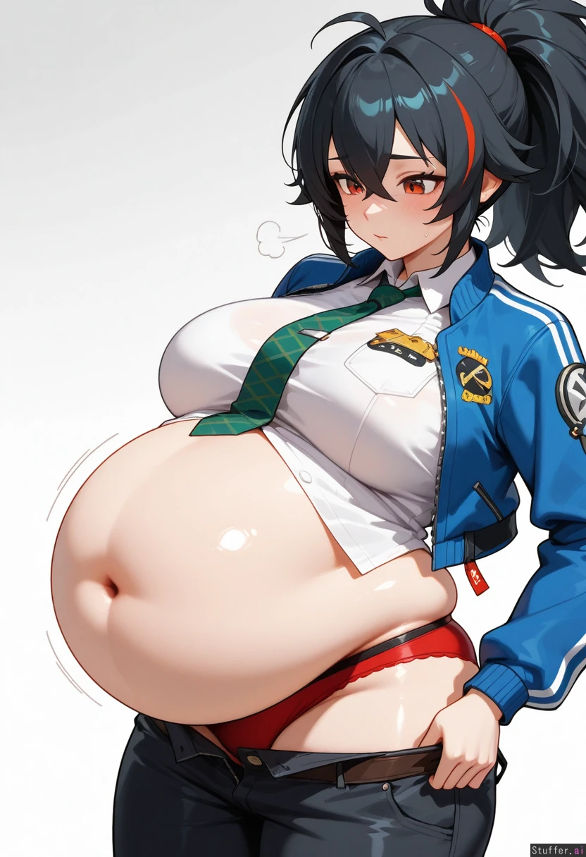 (Solo), Highres, Zhu_Yuan_(Zenless Zone Zero), (svelte), Huge belly, pants open, red panties, white background, black pants, weight gain, white buton shirt, green tie, blue jacket