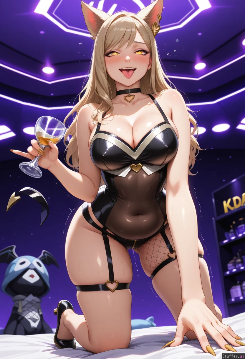 (best quality), (hdr), (detailed background), (motion lines), (expressive), (high rating), (highly detailed), intricate detail, (definition lines), detailed face, (highly detailed eyes), (glossy realistic skin), (good lighting), (detailed face), (clarity), (((( K/DA_Ahri)))) Lustful, Seductive, (sexually submissive), ((sadistic expression)), ((deep blush)), ((horny)), ((tipsy)), (panting), (Sweating), (Exhausted), Bimbo, (hearts), ((trembling)), ((quivering)), (Tall girl), (Beautiful girl), (((Luscious lips))), (goth girl), ((Shiny skin)), ((skindentation)), ((thick thighs)), ((plump)), ((chubby girl)), ((chubby belly:1.3)), slim face, ((deep navel)), soft belly, (((love handles))), (Nightclub), (((nervous))), ((looking at viewer:1.3)), ((viewing from below)), ((on all fours)), ((starry eyes)), ((star eyes)), ((belly hang)), ((stuffed belly:1.3)), ((gained weight:1.3)), ((body jiggle motions:1.7)), ((leaning forward)), ((clothes pull)), ((round belly)), ((boated belly:1.3)), pov, one leg up, ((holding glass)), ((belly expansion:1.3)), ((((( K/DA_Ahri))))) ((Gray eyes)), ((dark blonde hair)), ((long hair)), ((messy wavy hair)), ((black angel head wings)), ((dark eyeliner)), ((eyelashes)), ((demon tail)), ((Leather leotard)), ((dark fishnet tights)), ((covered navel:1.3)), ((laced top)), ((choker)), (thigh strap), (harness), (mascara under eyes), black heels, ((((Slim hourglass shape body, supermodel body, slim waist, cleavage overflow)))) ((Dazed:1.3)), ((intoxicated)), ((erect nipples)), ((gasping for air)), ((moaning)), ((food obsessed)), ((suggestive grin)), ((seductive smile)), ((milf)), (heavy breathing), ((gyaru nails)), ((long nails)), (big eyes), ((tongue out:1.3)), ((drooling)), ((drunk girl:1.7)), ahegao, ((glowing eyes)), ((flirtatious))