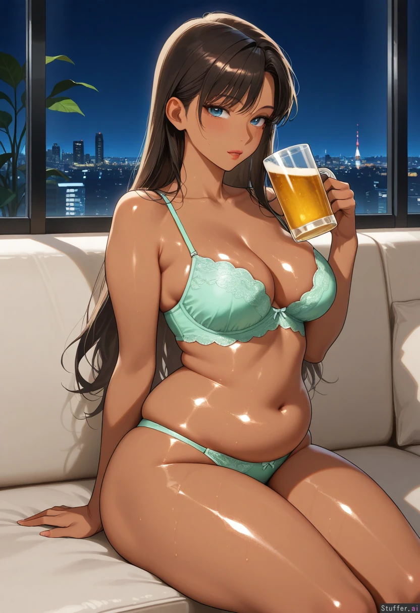 21 year old Korean female (gorgeous, stunning, beautiful, sexy, nsfw, correct anatomy), (skinny:1.4), (dark skinned:1.25), perfect anatomy, long wavy dark brown hair, slim face, blue eyes, defined jawline, makeup, narrow shoulders, medium breasts, (narrow waist:1.3)(soft chubby pudgy belly:1.2), (wide hips:1.05), (thick thighs:1.05), sage green lace bra and panties (skindentation), (glossy reflective lotioned oily body:1.4) modern outdoor rooftop lounge, outside, outdoors, modern plants in background, skyline, night time, side view sitting on couch, drinking beer (((belly inflation:0.6)))(((belly blush:0.6)))