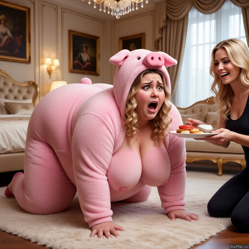 beautiful hyper obese ssbbw blob, fuzzy ping piggy onesie, scared, luxury bedroom, enormously saggy wide lower hyper belly that hangs to her knees, enormous wide round hips, enormous fat saggy arms, massive heavy hanging breasts, massive thick chunky thighs, massive thick protruding flabby chunky ass cheeks, curly, assisted by grinning blonde bimbo who is offering her a plate of food, on all fours, front view