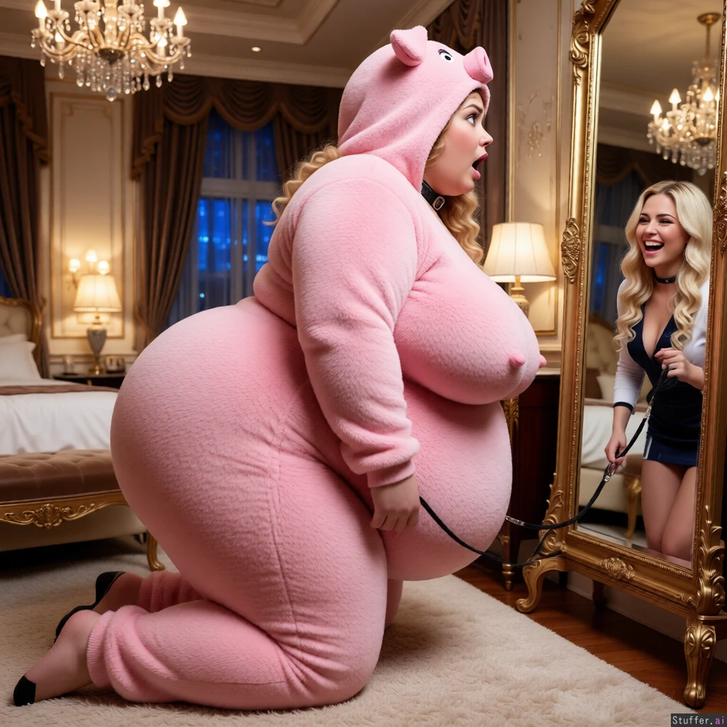 beautiful hyper obese ssbbw blob, fuzzy ping piggy onesie, scared, luxury bedroom, enormously saggy wide lower hyper belly that hangs to her knees, enormous wide round hips, enormous fat saggy arms, massive heavy hanging breasts, massive thick chunky thighs, massive thick protruding flabby chunky ass cheeks, curly, assisted by grinning blonde bimbo who is holding a leash attached to a collar, on all fours looking into a mirror, side view