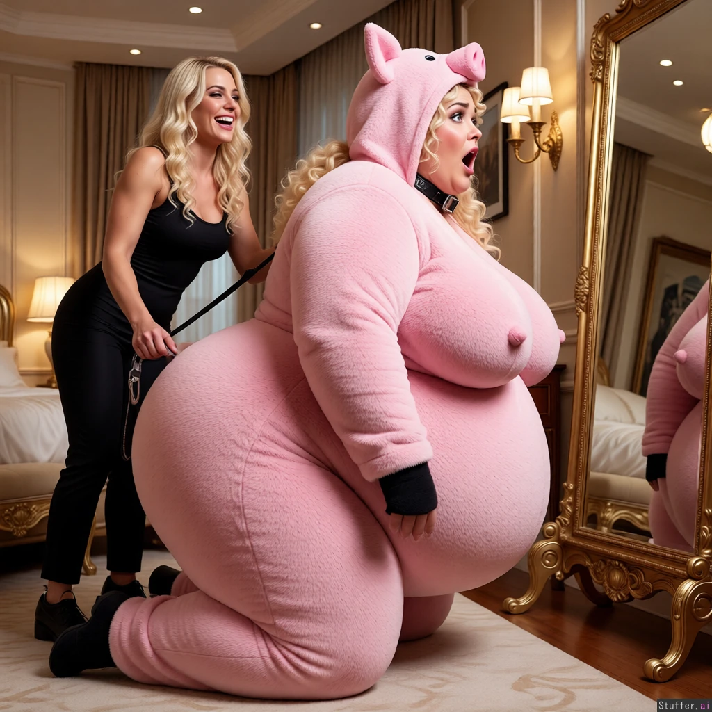 beautiful hyper obese ssbbw blob, fuzzy piggy onesie, scared, luxury bedroom, enormously saggy wide lower hyper belly that hangs to her knees, enormous wide round hips, enormous fat saggy arms, massive heavy hanging breasts, massive thick chunky thighs, massive thick protruding flabby chunky ass cheeks, curly, assisted by grinning blonde bimbo who is standing behind her holding a leash attached to a collar, on all fours looking into a mirror, side view
