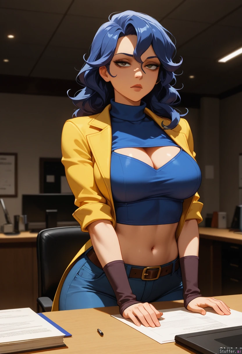 (Solo), Highres, Carmelita_Fox_(Sly Cooper), blue pants, blue crop top, yellow jacket, svelte, curvy, unamused, office, dark ambience