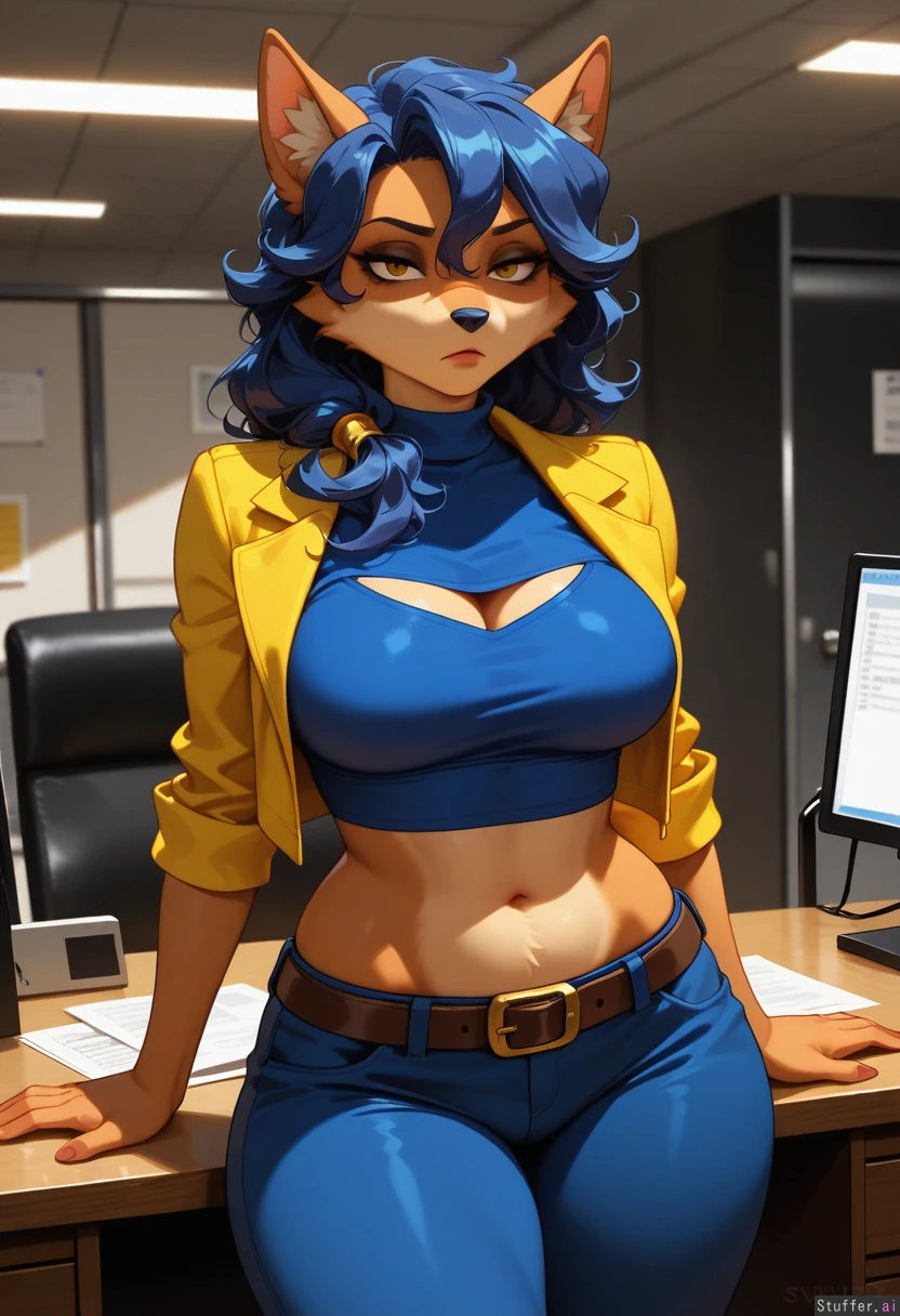 (Solo), Highres, Carmelita_Fox_(Sly Cooper), blue pants, blue crop top, yellow jacket, svelte, curvy, unamused, office, dark ambience, belt, furry