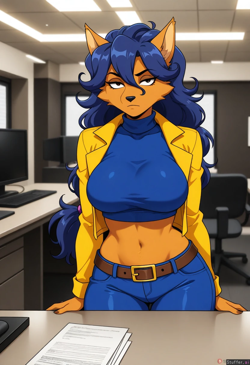 (Solo), Highres, Carmelita_Fox_(Sly Cooper), blue pants, blue crop top, yellow jacket, svelte, curvy, unamused, office, dark ambience, belt, furry, furanh_(artist)