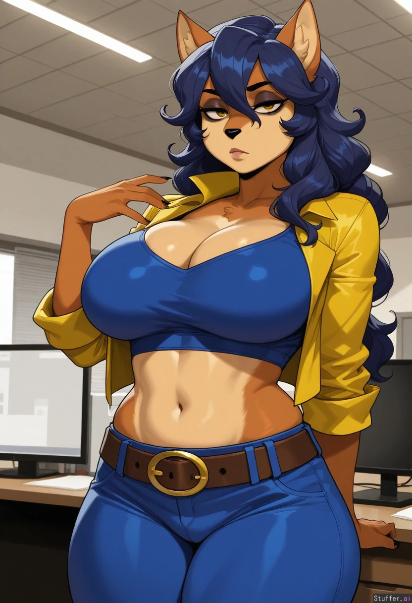 (Solo), Highres, Carmelita_Fox_(Sly Cooper), blue pants, blue crop top, yellow jacket, svelte, curvy, unamused, office, dark ambience, belt, furry, Krekkov (artist), KAMII MOMORU (artist),