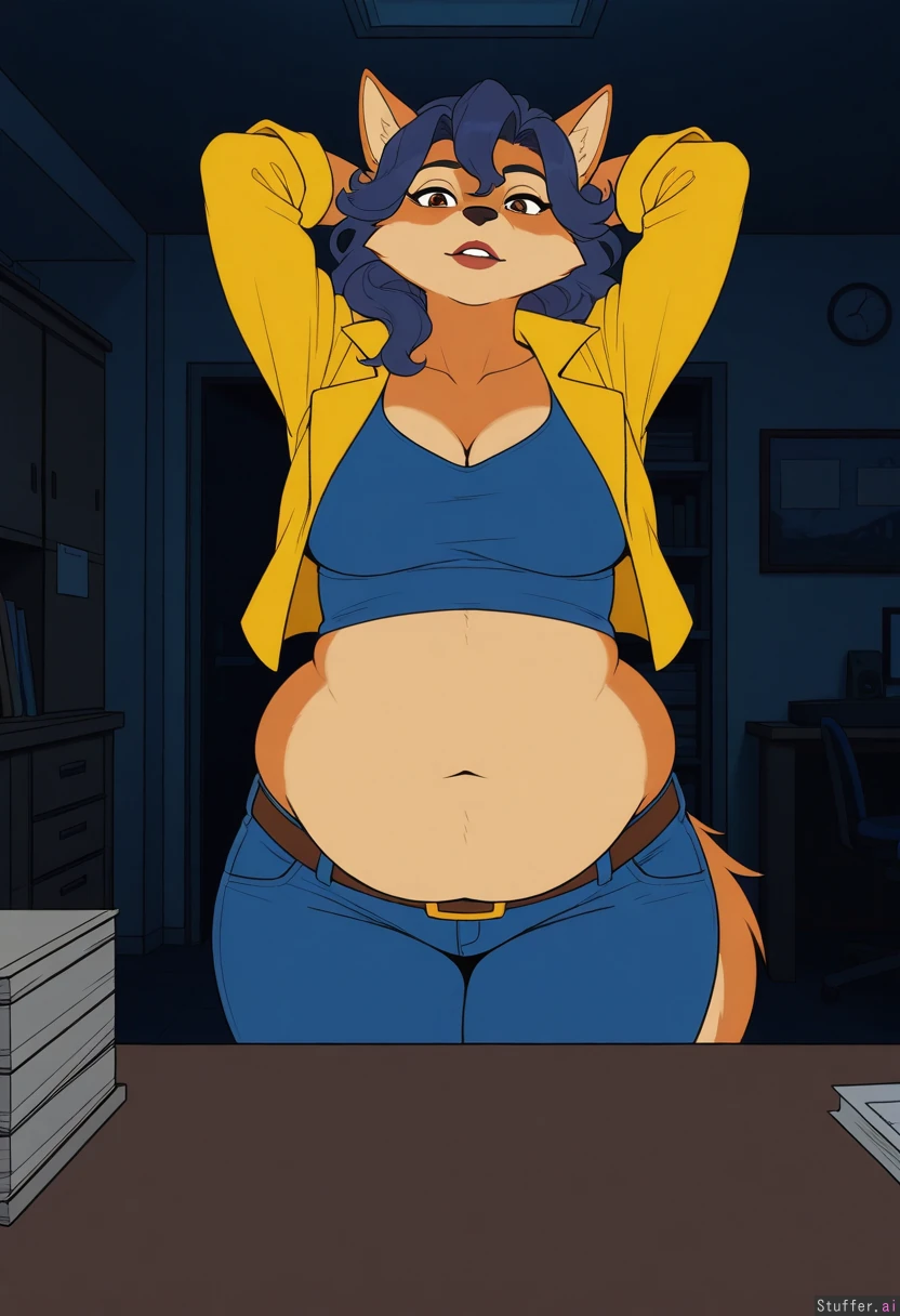 (Solo), Highres, Carmelita_Fox_(Sly Cooper), blue pants, blue crop top, yellow jacket, svelte, office, dark room, belt, furry, weight gain, flat colors, tanned belly