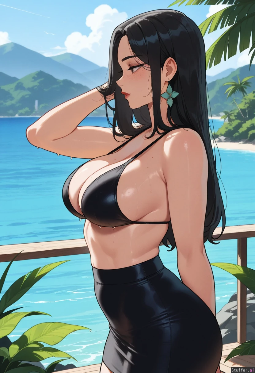 High quality, 4k, masterpiece, flawless, motion lines, side view, Nyantcha(artist), KAMII MOMORU(artist), Adult woman, Cute sweet look, Flawless beauty, Freckles, Long black hair, Wet hair, Slim chest, Slim waist, Swim skirt, Green flowers bikini top, Island, sea view, tropical forest, mountains