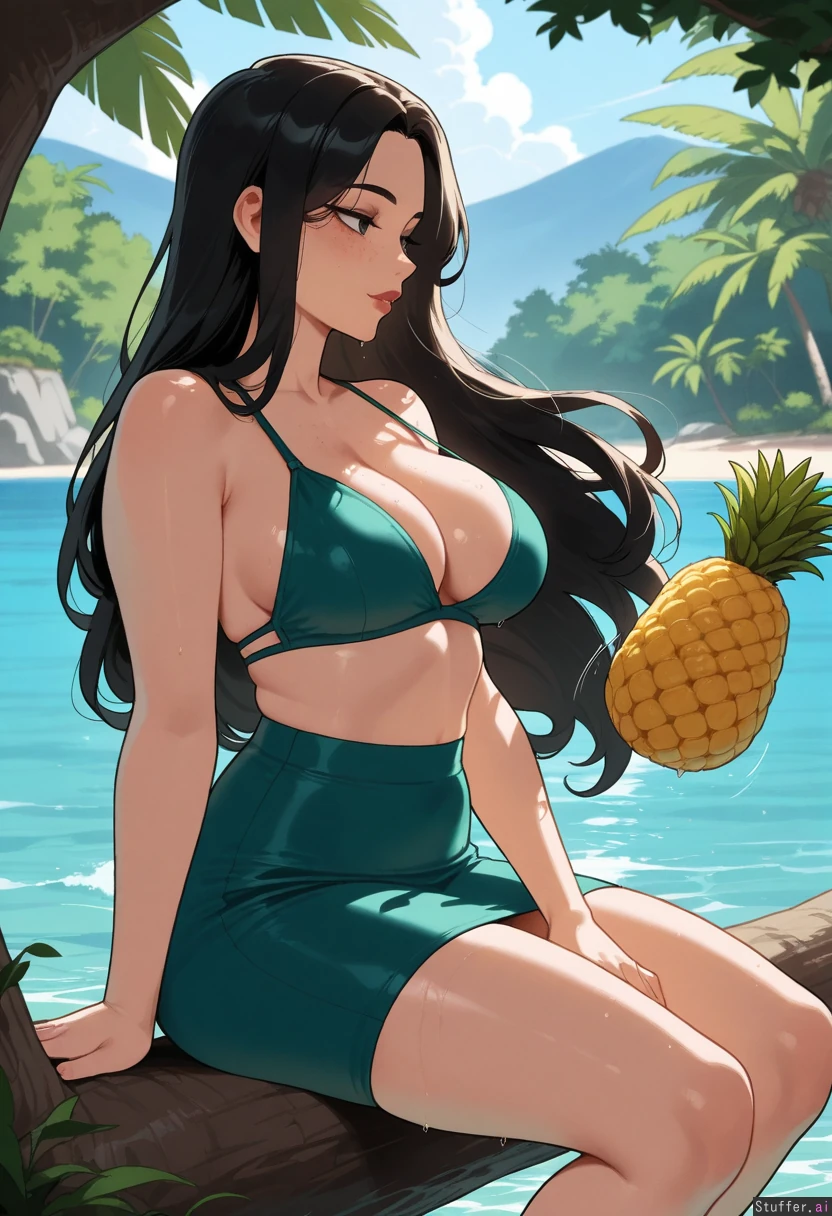 High quality, 4k, masterpiece, flawless, motion lines, side view, perfect shading, Nyantcha(artist), KAMII MOMORU(artist), Adult woman, Cute sweet look, Flawless beauty, Freckles, Long black hair, Wet hair, Enjoying herself, Calm, Enthusiastic sideways stare, Slim chest, Slim waist, Swim skirt, Green flowers bikini top, Island, sea view, tropical forest, mountains, Sitting down on a tree, Munching on pineapple