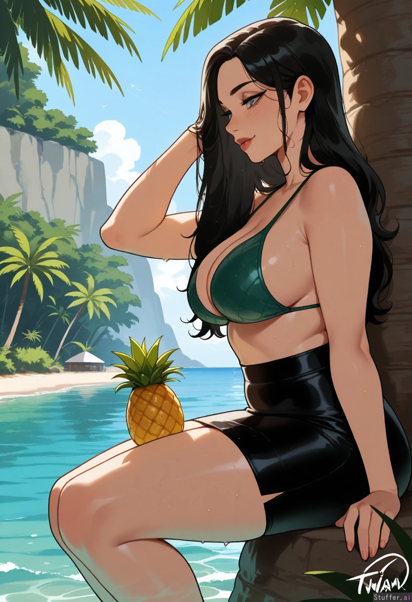 High quality, 4k, masterpiece, flawless, motion lines, side view, perfect shading, Nyantcha(artist), KAMII MOMORU(artist), Adult woman, Cute sweet look, Flawless beauty, Freckles, Long black hair, Wet hair, Enjoying herself, Calm, Enthusiastic sideways stare, Slim chest, Slim waist, Swim skirt, Green flowers bikini top, Island, sea view, tropical forest, mountains, Sitting down on a tree, Biting a pineapple