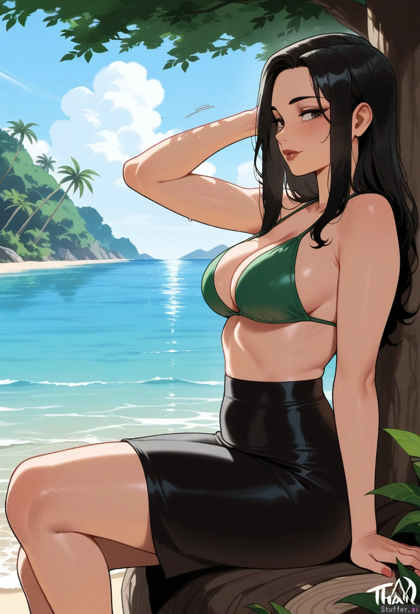 High quality, 4k, masterpiece, flawless, motion lines, side view, perfect shading, Nyantcha(artist), KAMII MOMORU(artist), Adult woman, Cute sweet look, Flawless beauty, Freckles, Long black hair, Wet hair, Enjoying herself, Calm, Enthusiastic sideways stare, Slim chest, Slim waist, Swim skirt, Green flowers bikini top, Island, sea view, tropical forest, mountains, Sitting down on a fallen tree trunk