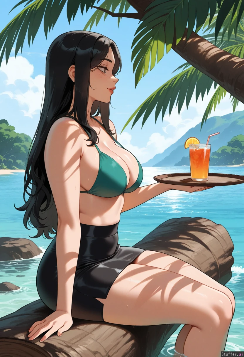 High quality, 4k, masterpiece, flawless, motion lines, side view, perfect shading, Nyantcha(artist), KAMII MOMORU(artist), Adult woman, Cute sweet look, Flawless beauty, Freckles, Long black hair, Wet hair, Enjoying herself, Calm, Enthusiastic sideways stare, Slim chest, Slim waist, Swim skirt, Green flowers bikini top, Island, sea view, tropical forest, mountains, Sitting down on a fallen tree trunk, Having a tray full with fruits