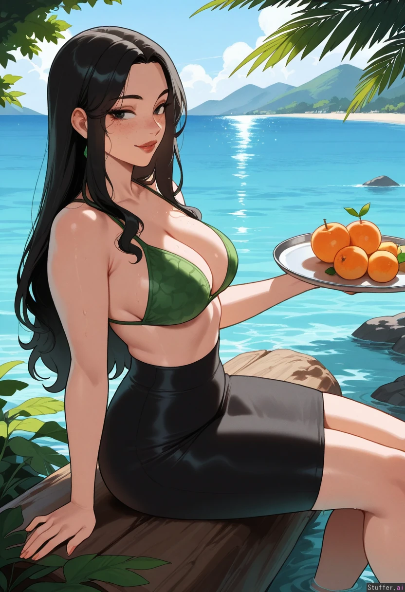 High quality, 4k, masterpiece, flawless, motion lines, side view, perfect shading, Nyantcha(artist), KAMII MOMORU(artist), Adult woman, Cute sweet look, Flawless beauty, Freckles, Long black hair, Wet hair, Enjoying herself, Calm, Enthusiastic sideways stare, Slim chest, Slim waist, Swim skirt, Green flowers bikini top, Island, sea view, tropical forest, mountains, Sitting down on a fallen tree trunk, (Having a tray full with fruits:1.5)
