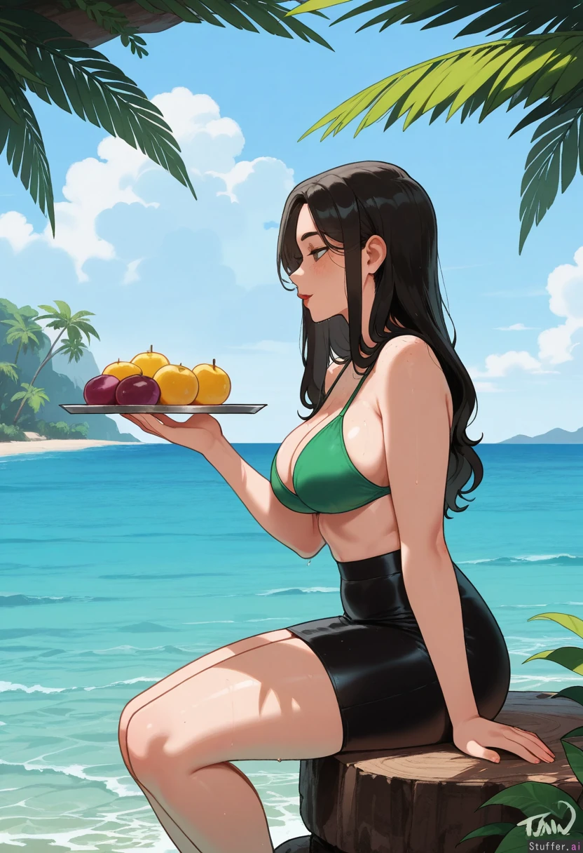 High quality, 4k, masterpiece, flawless, motion lines, side view, perfect shading, Nyantcha(artist), KAMII MOMORU(artist), Adult woman, Cute sweet look, Flawless beauty, Freckles, Long black hair, Wet hair, Enjoying herself, Calm, Enthusiastic sideways stare, Slim chest, Slim waist, Swim skirt, Green flowers bikini top, Island, sea view, tropical forest, mountains, Sitting down on a fallen tree trunk, (Having a tray full with bananas apples melons pineapples grapes)
