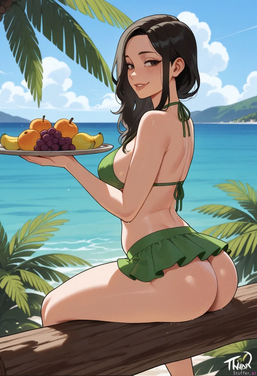 High quality, 4k, masterpiece, flawless, motion lines, side view, perfect shading, Nyantcha(artist), KAMII MOMORU(artist), Adult woman, Cute sweet look, Flawless beauty, Freckles, Long black hair, Wet hair, Calm, Enthusiastic sideways smile, Slim chest, Slim waist, Overweight belly, (Perky slim ass:1.5), Swim skirt, Green flowers bikini top, Island, sea view, tropical forest, mountains, Sitting down on a fallen tree trunk, (Having a tray full with bananas apples melons pineapples grapes)