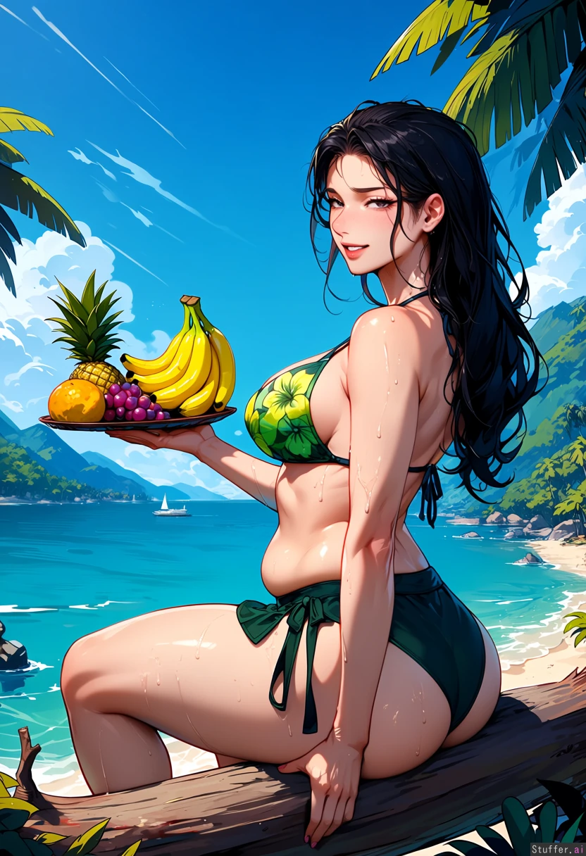 High quality, 4k, masterpiece, flawless, motion lines, side view, perfect shading, Nyantcha(artist), KAMII MOMORU(artist), Adult woman, Cute sweet look, Flawless beauty, Freckles, Long black hair, Wet hair, Calm, Enthusiastic naughty smile, Slim chest, Slim waist, Overweight belly, (Perky slim ass:1.5), Swim skirt, Green flowers bikini top, Island, sea view, tropical forest, mountains, Sitting down on a fallen tree trunk, (Having a tray full with bananas apples melons pineapples grapes)