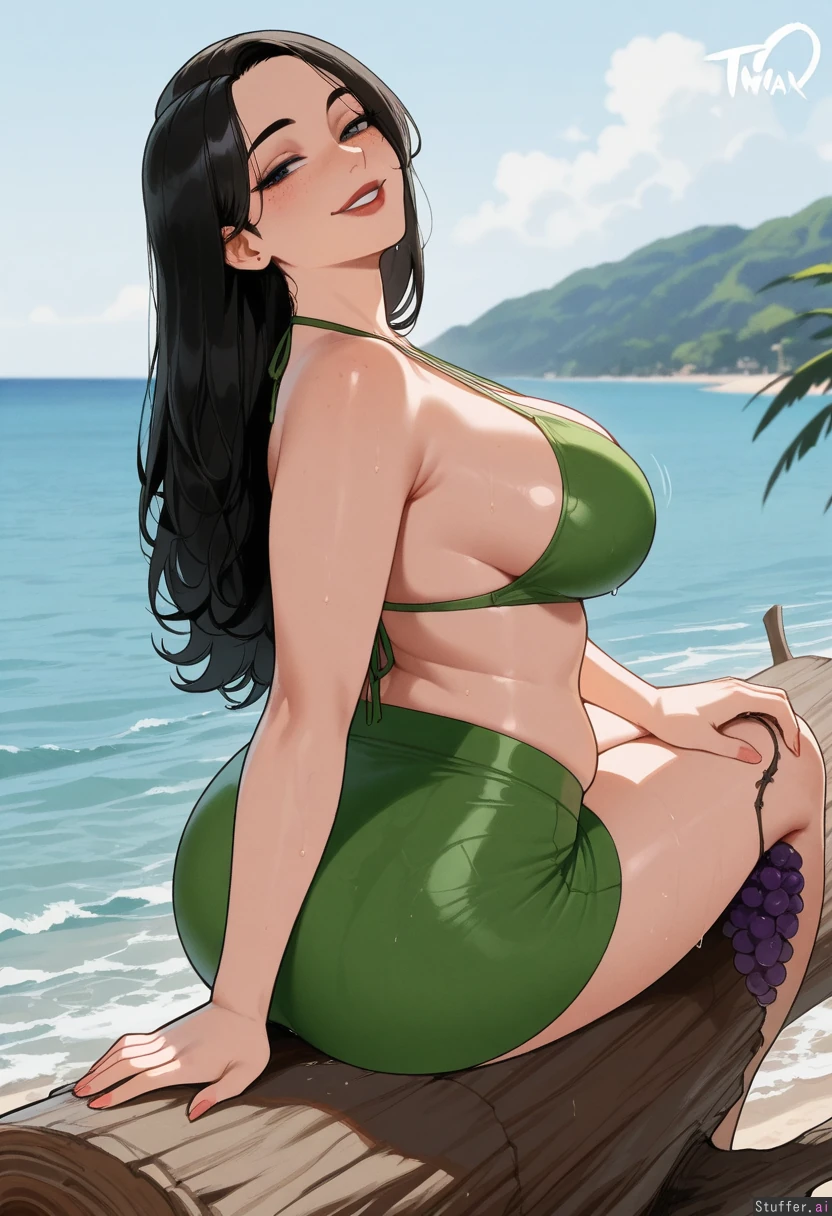 High quality, 4k, masterpiece, flawless, motion lines, side view, perfect shading, Nyantcha(artist), KAMII MOMORU(artist), Adult woman, Cute sweet look, Flawless beauty, Freckles, Long black hair, Wet hair, Calm, Flirty naughty smile, Slim chest, Slim waist, Overweight belly, Perky ass, Fat huge thighs, Swim skirt, Green bikini top, Island, sea view, tropical forest, mountains, Sitting down on a fallen tree trunk, Head thrown back, Holding grapes above her mouth