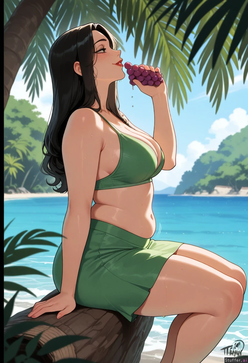 High quality, 4k, masterpiece, flawless, motion lines, side view, perfect shading, Nyantcha(artist), KAMII MOMORU(artist), Adult woman, Cute sweet look, Flawless beauty, Freckles, Long black hair, Wet hair, Calm, Flirty naughty smile, Slim chest, Slim waist, Overweight belly, Thick thighs, Swim skirt, Green bikini top, Island, sea view, tropical forest, mountains, Sitting down on a fallen tree trunk, Head thrown back, Holding grapes above her mouth