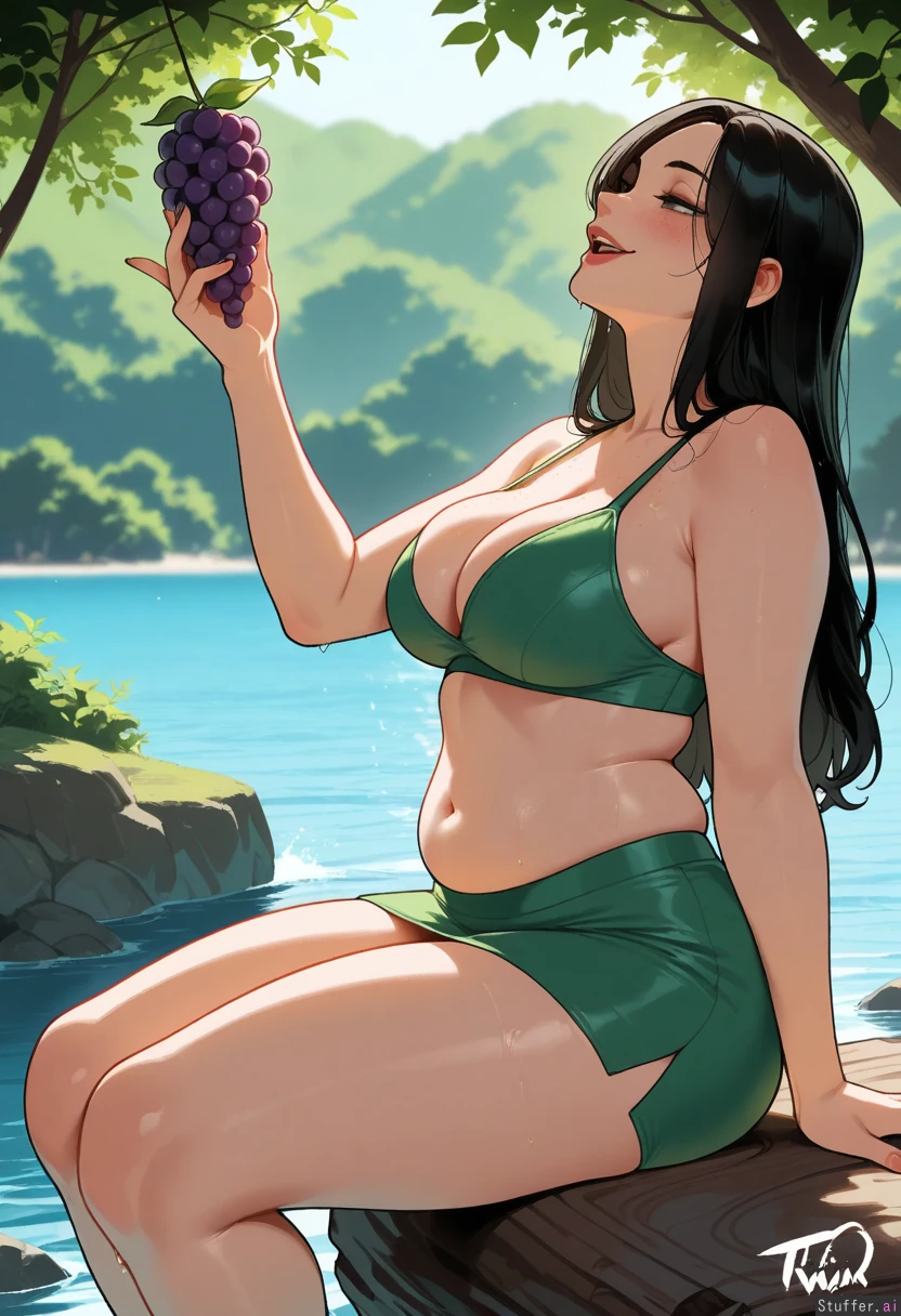 High quality, 4k, masterpiece, flawless, motion lines, side view, perfect shading, Nyantcha(artist), KAMII MOMORU(artist), Adult woman, Cute sweet look, Flawless beauty, Freckles, Long black hair, Wet hair, Calm, Flirty naughty smile, Slim chest, Slim waist, Overweight belly, Thick thighs, Swim skirt, Green bikini top, Island, sea view, tropical forest, mountains, Sitting down on a fallen tree trunk, Head thrown back, Holding grapes above her open mouth