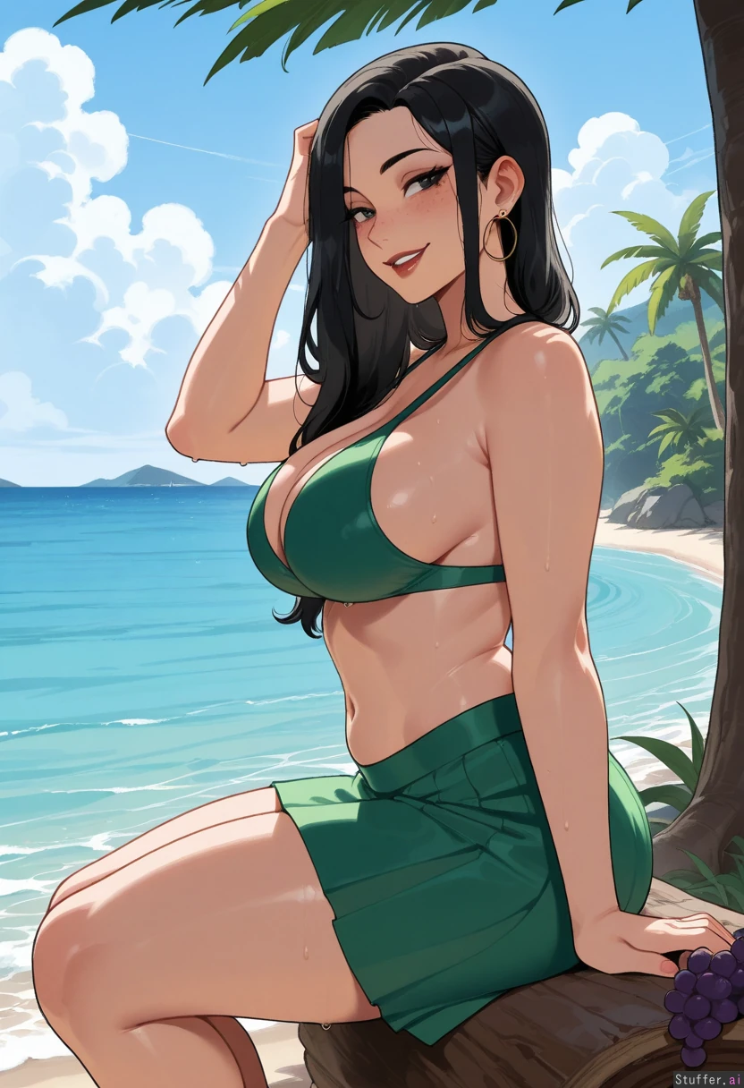 High quality, 4k, masterpiece, flawless, motion lines, side view, perfect shading, Nyantcha(artist), KAMII MOMORU(artist), Adult woman, Cute sweet look, Flawless beauty, Freckles, Long black hair, Wet hair, Calm, Flirty naughty smile, Slim chest, Slim waist, Toned belly, Thick thighs, Swim skirt, Green bikini top, Island, sea view, tropical forest, mountains, Sitting down on a fallen tree trunk, Holding grapes high above her open mouth