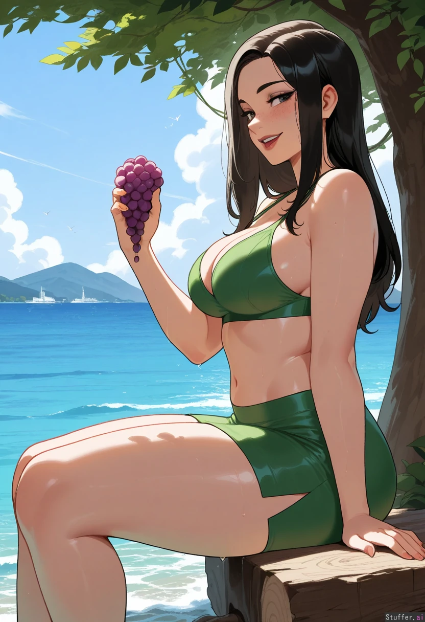 High quality, 4k, masterpiece, flawless, motion lines, side view, perfect shading, Nyantcha(artist), KAMII MOMORU(artist), Adult woman, Cute sweet look, Flawless beauty, Freckles, Long black hair, Wet hair, Calm, Flirty naughty smile, Slim chest, Slim waist, Toned belly, Thick thighs, Swim skirt, Green bikini top, Island, sea view, tropical forest, mountains, Sitting down on a fallen tree trunk, Holding grapes high above her open mouth