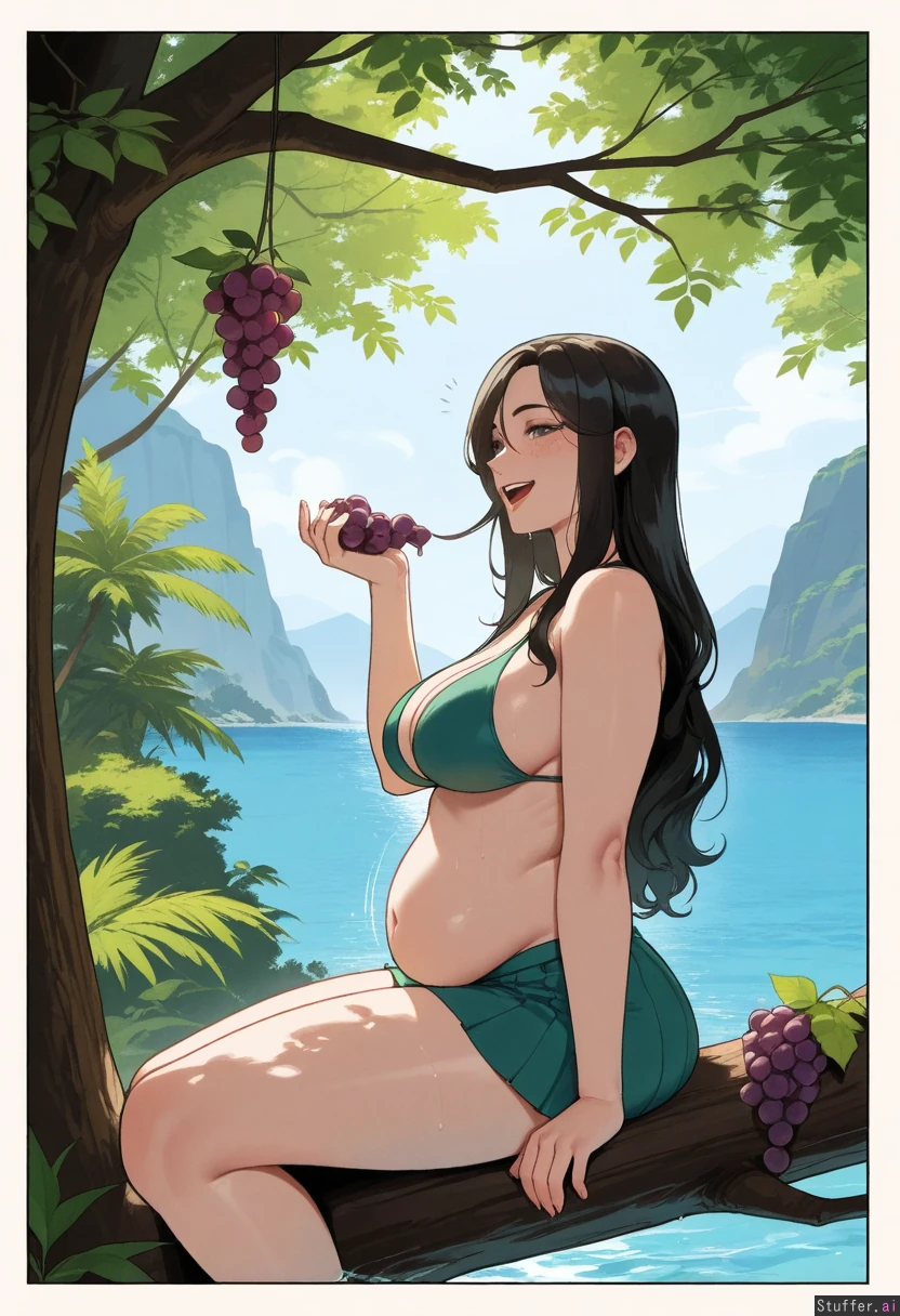 High quality, 4k, masterpiece, flawless, motion lines, side view, perfect shading, Nyantcha(artist), KAMII MOMORU(artist), Adult woman, Cute sweet look, Flawless beauty, Freckles, Long black hair, Wet hair, Calm, Flirty naughty smile, Slim chest, Slim waist, (Saggy hanging thin belly:1.5), Thick thighs, Feet in water, Swim skirt, Green bikini top, Island, sea view, tropical forest, mountains, Sitting down on a fallen tree trunk, (Eating grapes high above her open mouth:1.5)