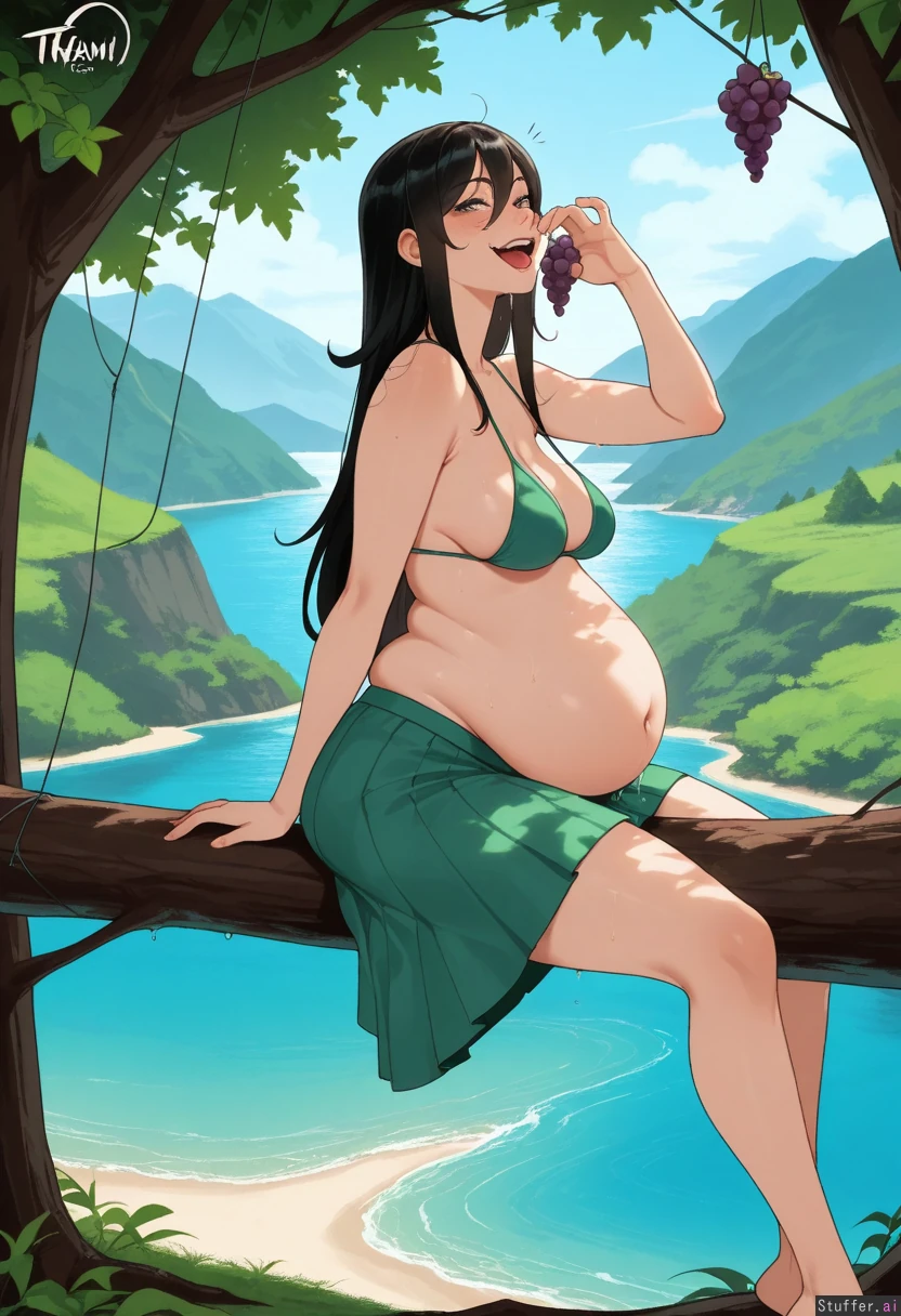 High quality, 4k, masterpiece, flawless, motion lines, side view, perfect shading, Nyantcha(artist), KAMII MOMORU(artist), Solo Adult woman, Cute sweet look, Flawless beauty, Freckles, Long black hair, Wet hair, Drunk, Flirty naughty smile, Slim chest, Slim waist, (Saggy hanging thin belly:1.7), Thick thighs, Feet in water, Swim skirt, Green bikini top, Island, sea view, tropical forest, mountains, Sitting down on a fallen tree trunk, (Eating grapes high above her open mouth:1.5)