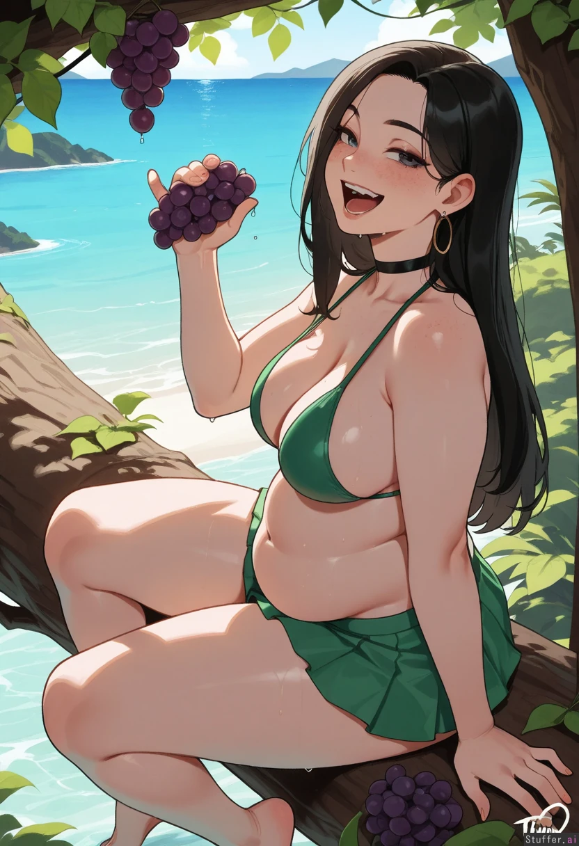 High quality, 4k, masterpiece, flawless, motion lines, side view, perfect shading, Nyantcha(artist), KAMII MOMORU(artist), Solo Adult woman, Cute sweet look, Flawless beauty, Freckles, Long black hair, Wet hair, Drunk, Flirty naughty smile, Slim chest, Slim waist, (Saggy hanging thin belly:1.3), Thick thighs, Feet in water, Swim skirt, Green bikini top, Island, sea view, tropical forest, mountains, Sitting down on a fallen tree trunk, (Eating grapes high above her open mouth:1.5)