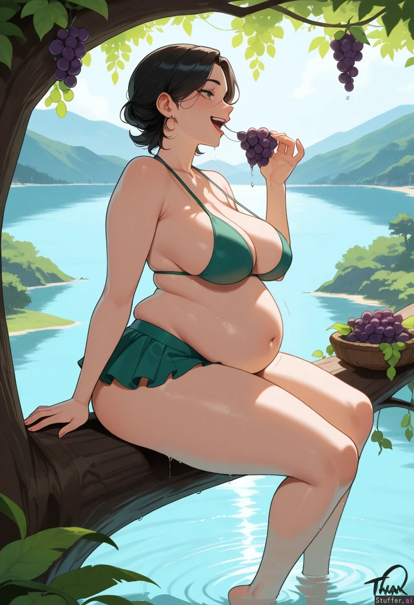 High quality, 4k, masterpiece, flawless, motion lines, side view, perfect shading, Nyantcha(artist), KAMII MOMORU(artist), Solo Adult woman, Cute sweet look, Flawless beauty, Freckles, Long black hair, Wet hair, Drunk, Flirty naughty smile, Slim chest, Slim waist, (Saggy hanging thin belly:1.5), Full belly, Chubby belly, Thick thighs, Feet in water, Plump soft ass, Swim skirt, Green bikini top, Island, sea view, tropical forest, mountains, Sitting down on a fallen tree trunk, (Eating grapes high above her open mouth:1.5)