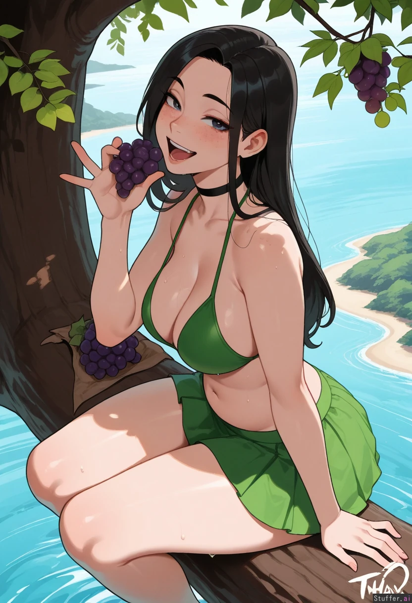 High quality, 4k, masterpiece, flawless, motion lines, side view, perfect shading, Nyantcha(artist), KAMII MOMORU(artist), Solo Adult woman, Cute sweet look, Flawless beauty, Freckles, Long black hair, Wet hair, Drunk, Flirty naughty smile, Slim chest, Slim waist, Saggy hanging thin belly, Thick thighs, Feet in water, Swim skirt, Green bikini top, Island, sea view, tropical forest, mountains, Sitting down on a fallen tree trunk, (Eating grapes high above her open mouth:1.5)